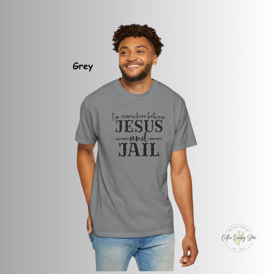 Somewhere Between Jesus and Jail Garment-Dyed Mens Comfort Colors T-shirt