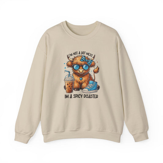 Im not a hot mess Im a spicy disaster" Highland Cow Fall vibes Women's™ Crewneck Sweatshirt