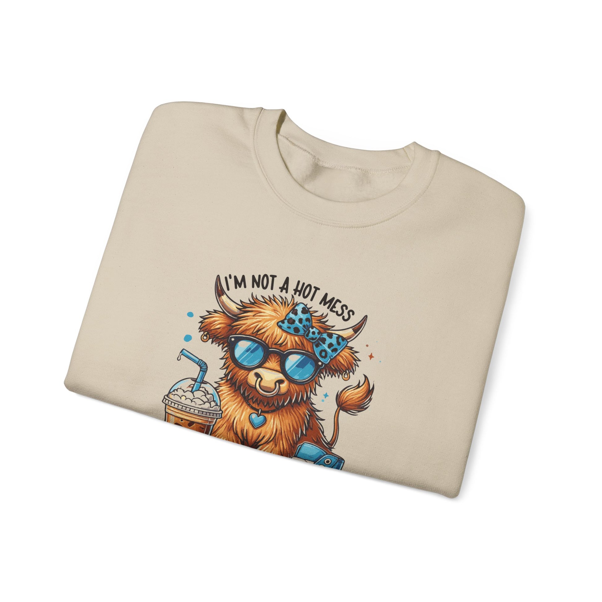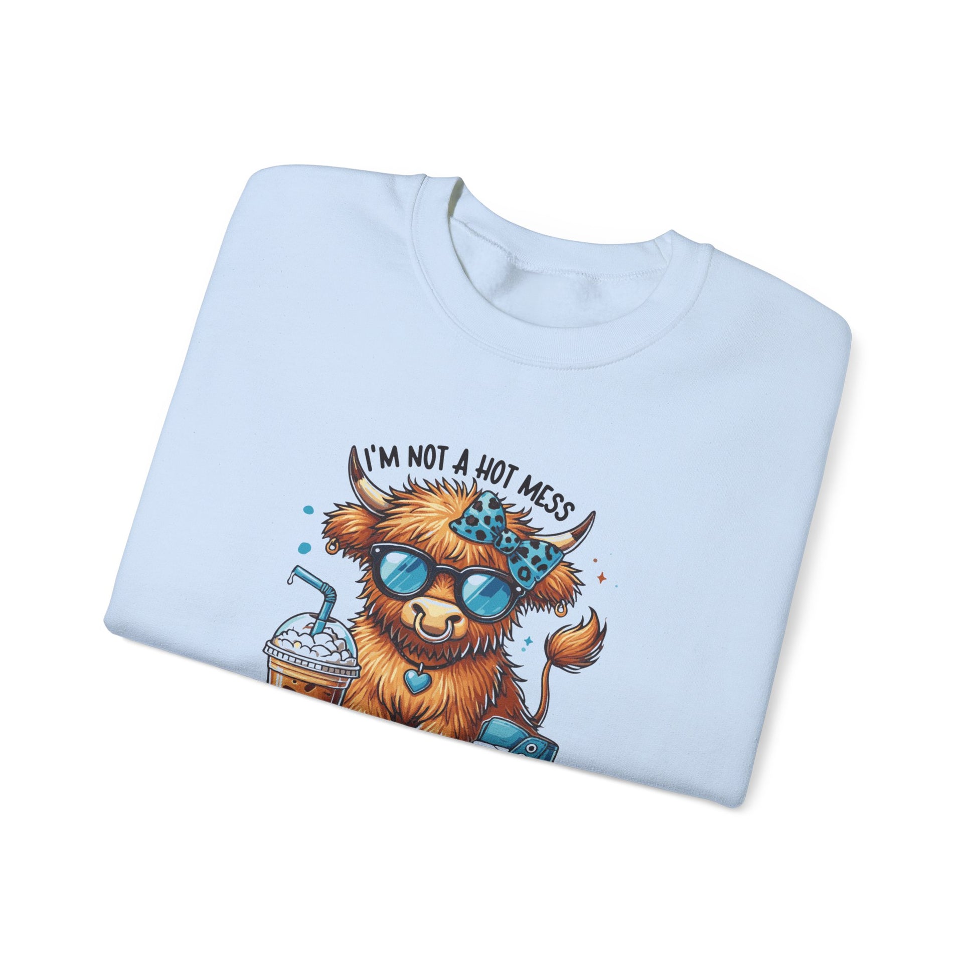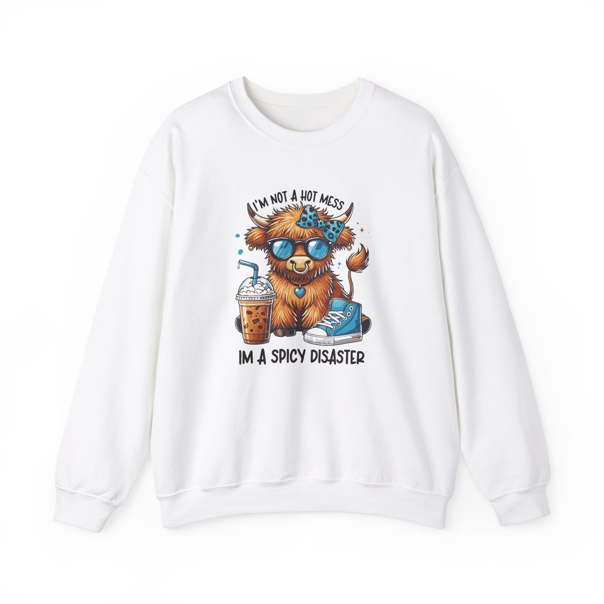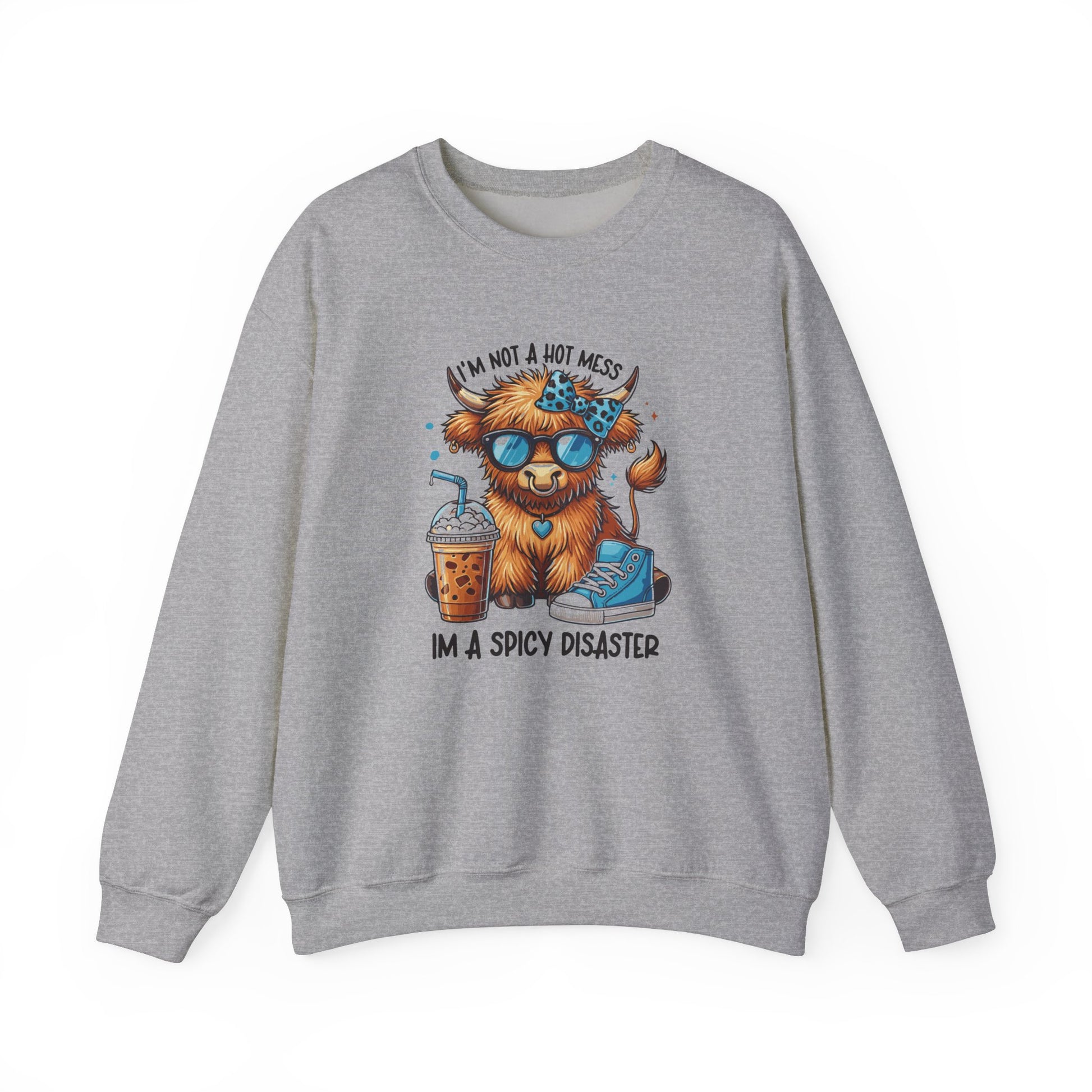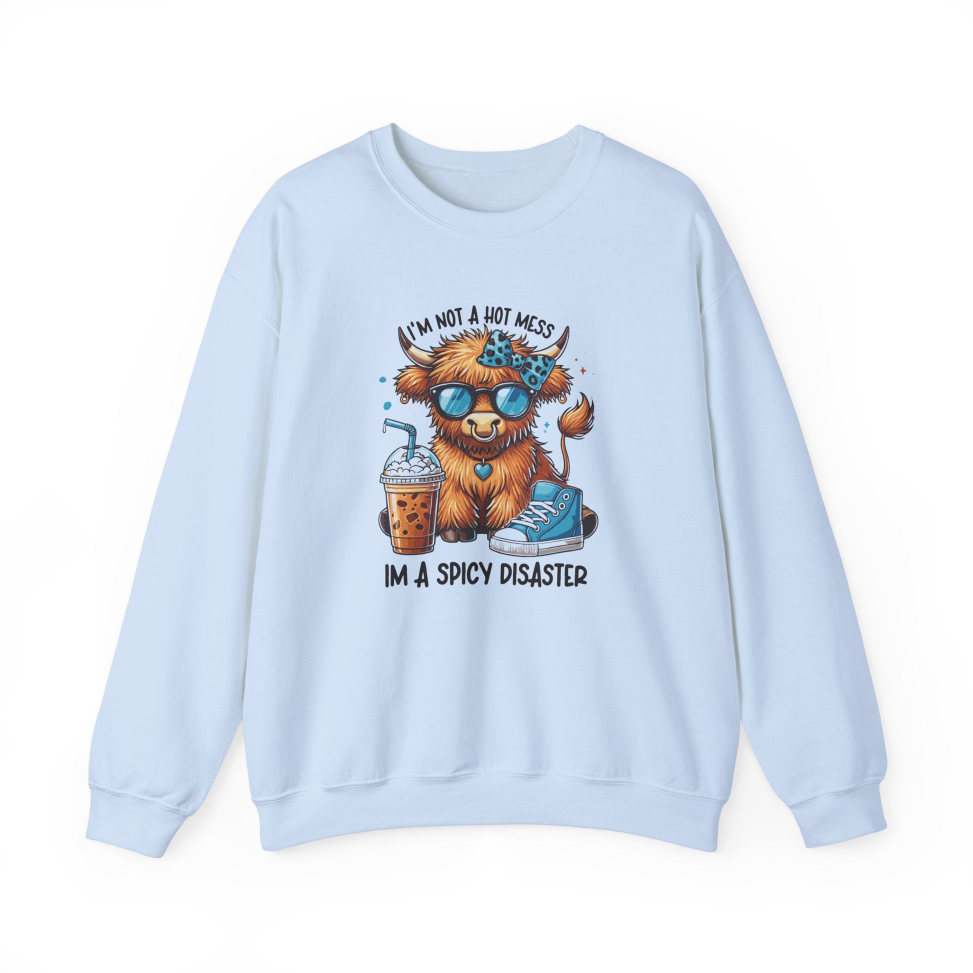 A cozy and durable crewneck sweatshirt featuring a highland cow graphic design that says 'Im not a hot mess im a spicy disaster.' Perfect for those looking for a unique and quirky addition to their wardrobe. Ideal for those who love animals and humor. Great for casual wear during the colder months or as a statement piece for casual gatherings and holiday events.