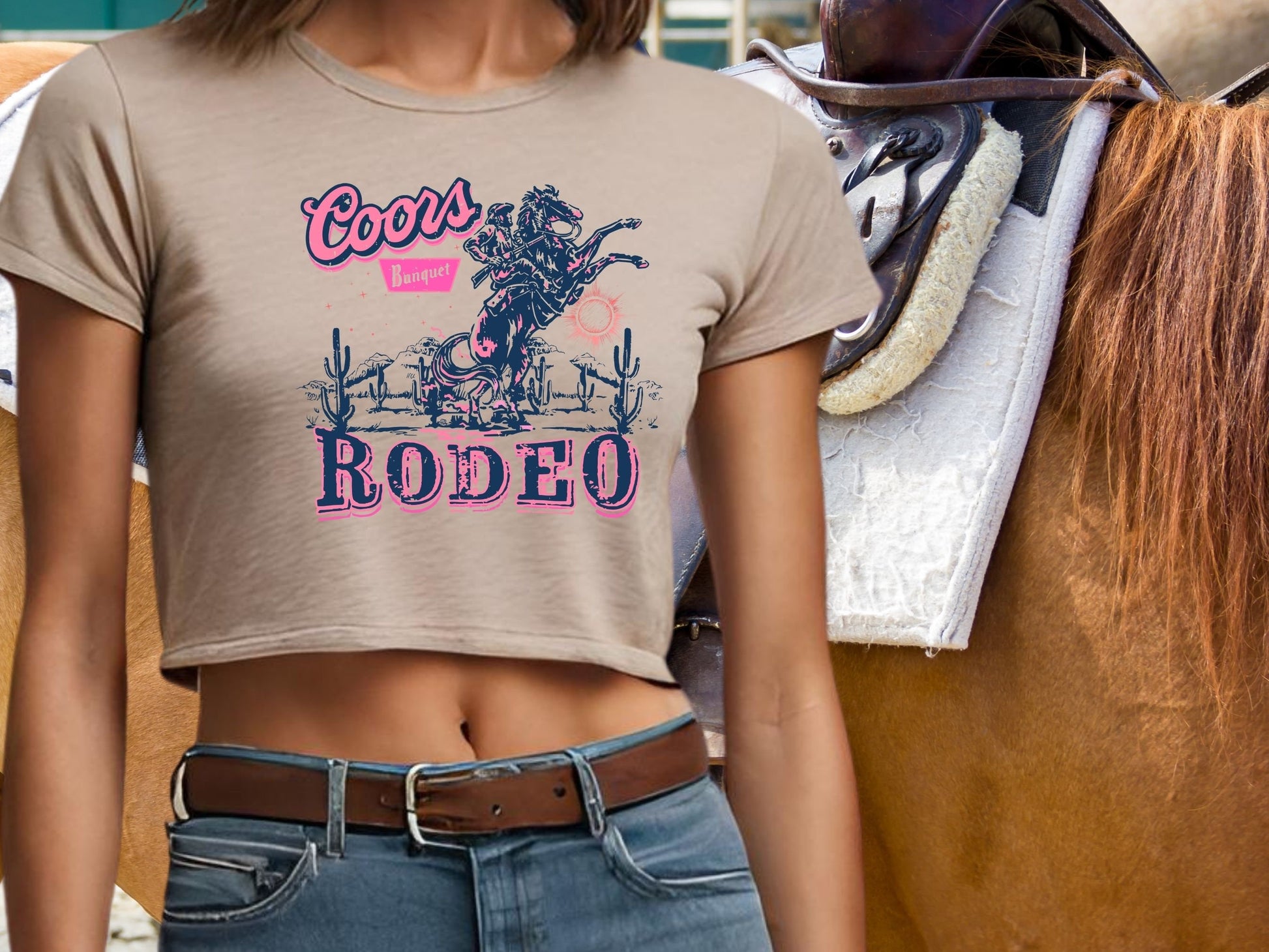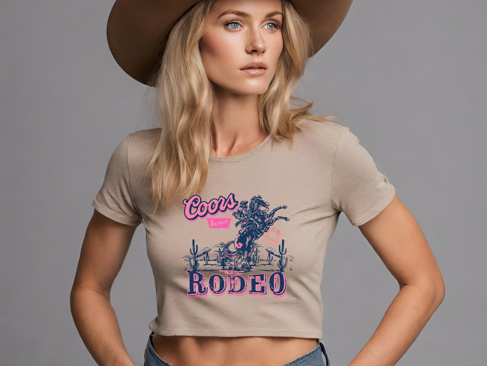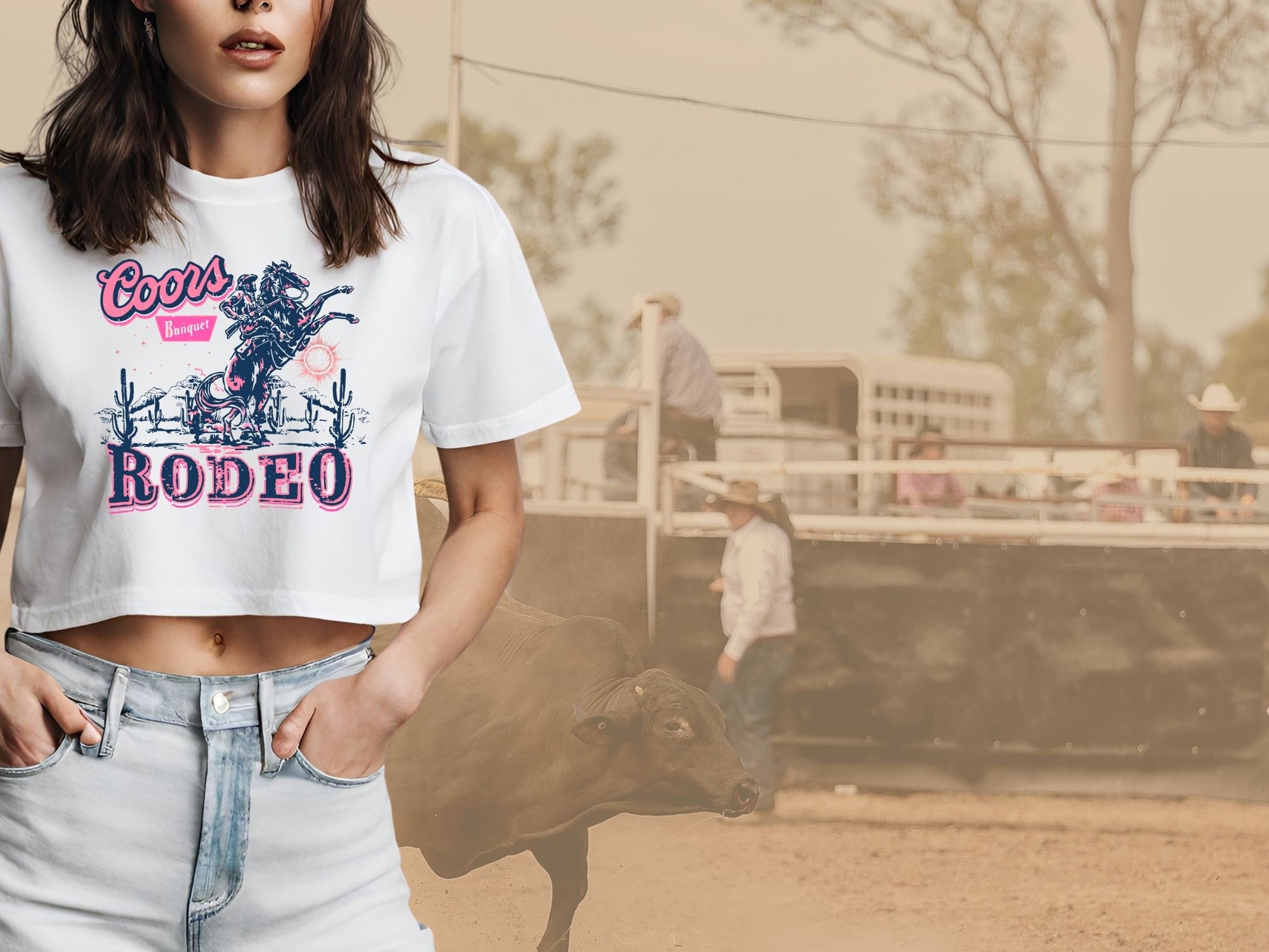 Introducing the Coors Rodeo Cropped Tshirt, the perfect cowgirl shirt to add a touch of Western charm to your wardrobe. This Cropped Tee, featuring the iconic Coors Rodeo design, is not just a stylish piece but also a great gift for your girlfriend or any beer enthusiast in your life. Whether you prefer Coors Banquet or Coors Light, this Western Tee will make a fantastic craft beer shirt that stands out from the rest. Treat her to a versatile and comfortable Western shirt that she'll love to wear on any occasion. Equipped with a flowy fit for easy-going appearances, this women’s tee features a tailored sleeve along with a modest fit. Made with 65%/35% polyester/viscose fabric for stretchiness and equipped with a tear-away label for a scratch-free experience.